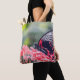 A striking red‑and‑black butterfly pauses on a bloom, its wings fanning like delicate stained glass as it sips honey from a sunlit flower. The bold crimson accents shimmer against deep ebony wings, creating a dramatic contrast that feels both elegant and energetic. Surrounding the butterfly, soft petals and curling vines frame the scene, giving the design a graceful, organic flow—perfect for a tote or accessory that wants to stand out without feeling loud.