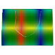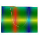 A vibrant gift bag featuring a glossy, rainbow gradient design with vertical stripes. The white handles contrast against the colorful background.