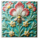 A ceramic tile featuring a raised relief design of flowers and a yellowjacket bee. The background color of the tiles is a vibrant turquoise. The top row of tiles displays two flowers with red and white petals and yellow centers, surrounded by green leaves and tendrils. The bottom row features smaller yellow flowers with green centers, also accompanied by green leaves and tendrils.
