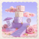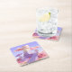 Dieser Untersetzer besticht durch ein skurriles Kinderzimmer mit einer pastellfarbenen Farbpalette in Rosa- und Lavendeltönen. In der Mitte sind drei alphabetische Blöcke vertikal gestapelt, die auf weißem Hintergrund rosa, beige und lavendele Buchstaben zeigen. Die Blöcke sind auf einer zylindrischen Lavendelplattform. Ein Lavendel-Schaukelstuhl sitzt an den links Häuserblöcken, ein Lavendelschirm steht in der Nähe. Rosa Rosen sind in der Szene mit einer großen Rose in der unteren rechten Ecke. Eine goldene Uhr mit römischen Ziffern wird auf einer Lavendelplattform rechts neben den Blöcken montiert. Rosa flauschige Wolken mit goldgelben Metallorben schweben im Hintergrund in einem hellblauen Himmel. Die Szene ist mit goldenen metallischen Kugeln über dem rosa Boden dekoriert. Eine Lavendeltreppe mit geometrischen Stufen führt bis zur Plattform, auf der die Blöcke platziert sind. Die Komposition hat eine traumhafte, märchenhafte Qualität. Der Untersetzer ist ein geschmolzener Untersetzer aus viereckigem Zellstoff. Das Untersetzer Set umfasst sechs Untersetzer.