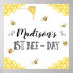 Bee Theme First Bee-Day Anniversaire Poster Sweet bee thème de premier anniversaire affiche avec différentes abeilles mignonnes, un peigne de miel et du miel gouttant. Quelques tourbillons décoratifs viennent compléter le décor. Cette affiche peut être utilisée pour la fête d'anniversaire d'une fille ou d'un garçon.
