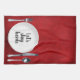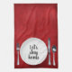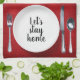 Weiße Tafel mit Silberbesteck auf rotem Hintergrund und "lasst uns Zuhause bleibe" Text. Text ist bearbeitbar.