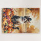 Ein Aquarellbild einer fröhlichen Katze inmitten eines Haufen lebendiger Herbstlaub, umgeben von winzigen Kürbissen und verstreuten Eicheln. Die Katze trägt einen kleinen Pilgerhut und strahlt vor Freude aus, um den Geist des Erntedanks zu erfassen. Im Hintergrund sorgen weiche Erntefelder und goldfarbene Bäume für eine friedliche Landschaft. Die sanfte Struktur und die warmen, gedämpften Herbsttöne verleihen der Szene ein gemütliches, nostalgisches Gefühl, das perfekt ist, um die Schönheit der Saison zu feiern.