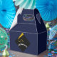 Einzigartige Graduierungsparty Gefallen Box Geschenke mit Glückwünschen Vorlage und schwarzen Graduierdeckel mit Goldkleckse auf marineblau Hintergrund.