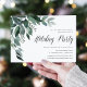 Des feuilles d'eucalyptus à l'aquarelle et du feuillage vert en cascade dans le coin supérieur gauche sont invités à la fête de vacances, élégante et festive. Customisez avec vos détails de fête de Noël alignés à droite, agrémentés de "Fête de Noël" en écriture chic de script de calligraphie. Les invitations se retournent vers le vert de la forêt solide.