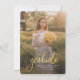 Fügen Sie Ihr Lieblings-Foto, die Ankündigung des Abschlusses und die Party Einladung auf der Rückseite hinzu, indem Sie auf die Schaltfläche "Personalisieren" klicken. Mit einem vertikalen Foto mit dem Wort "Absolvent" in fett formatierter Schrift.