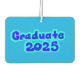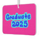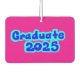 Ein Air Freshener für Ihr Auto, mit "Graduate 2025" vorne und hinten, in dunkelblau gezeichnet, und hellblau, = ( Art by P.J.M.) Mit rosa, farbiger Hintergrund auf der Vorderseite. Mit einem mittelblauen, farbigen Hintergrund auf der Rückseite. Mit Pine Scent = optional.