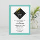 Creative Abschluss lädt mit klassischem Schwarz-Mütze- und Goldtassel-Design auf aquamarinem, blauen Hintergrund ein.