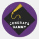 Klassische Abschluss-Geschenksticker oder Gastgeschenk-Etiketten mit schwarzer Graduierungskappe mit Goldkleckse auf lila Hintergrund. Bearbeiten Sie den Text, um den Namen des Senior Class Grades hinzuzufügen.