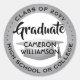 Fügen Sie mit diesen modernen Kalligraphie-Rundaufklebern/-Umschlag Aufklebern eine elegante personalisierte Touch zu Uni- oder Highschool-Abschlussankündigungen und Einladungen hinzu. Das Design besticht durch eine silberne Imitat-Massivplatte aus metallischer Folie und einen stylischen schwarzen Typografen-Graduiertennamen, Schule und Klassenjahr. Macht eine schicke, maßgeschneiderte Ergänzung zu Graduiertenfavoriten und Dekorationen. Als Option, ändern Sie den gebogenen Text in einen Namen und Adresse für die Verwendung als runde Rücksendeadressen-Aufkleber auf Einladungen oder danke Ihnen Notizen.