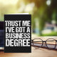 Vertrau mir, ich habe einen Abschluss in Wirtschaft got. Ein Abschluss Spaß Ausweis, um einem Absolventen zu gratulieren, der einen Master of Business Administration von einer Uni oder Universität. Ein lustiges Zitat von einem Geschäftsmann, einer Geschäftsfrau oder einem Geschäftsmann.
