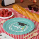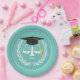 Einzigartiger Jurastudio-Teller-Design mit kreativen Maßstäben für die Rechtspflege mit schwarz-goldfarbenem Graduierungsoberteil auf rotem Hintergrund.