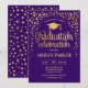 Einladung zur Graduiertenparty für Männer oder Frauen. Elegante Einladungskarte in königlicher lila und goldener Form. Modernes, einfaches Design mit Imitate Glitzer Confetti, eine Kappe und Typografie Drehbuch Schriftart. Ideal für einen stilvollen Abschluss.