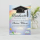 Mit dieser eleganten Ankündigungskarte und Party Einladung können Sie Ihren Uni-Abschluß bei Familie und Freunden ankündigen. Dieses moderne Design-Template verfügt über eine schwarze Graduierungskappe auf einem Hintergrund eines Regenbogens und eines blauen Himmels mit den Details in schwarzem Skript unten. Die Rückseite der Karte hat eine Party Einladung, die Sie anpassen können. Herzlichen Glückwunsch zu Ihrem Abschluss! Designed by artist Tim Coffey.