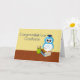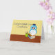 Herzlichen Glückwunsch an den Absolvent mit einer niedlichen Cartoon Eule mit blauen Federn mit einer Kappe und Diplom. Er sitzt auf einem Stapel Bücher und hat neben ihm einen Bleistifthalter. Sie können den Insidertext bearbeiten.