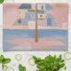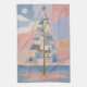An abstract, cubist-inspired painting featuring a stylized Christmas tree constructed from blocks of light blue, white, and tan geometric shapes. The tree is centered and symmetrical, adorned with small golden ornaments and topped with a prominent star. The background is composed of broad, layered brushstrokes in a muted pastel palette of dusty rose, pale pink, and soft sky blue, resembling patchwork fields or atmospheric blocks of color. Two circular white shapes, possibly moons or large ornaments, appear in the upper corners. The overall effect is a modern, minimalist take on a traditional holiday subject, characterized by simplified forms and a cool, soft color scheme.