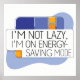This abstract illustration features two stylized figures in a dark blue and black environment, both seemingly engaged with technology. On the right, a person with dark skin and curly hair is using a laptop, connected by a cable, with a series of blue and white bars next to them, resembling battery levels. To the left, another figure in blue is hunched over a tablet. Above the figures is a white speech bubble with the text "I'm not lazy, I'm on energy-saving mode," written in a clean, sans-serif font. The overall image uses a limited color palette of blues, black, and white to convey a modern theme related to technology, energy consumption, and the contemporary concept of 'energy-saving mode' as a personal state.