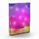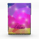 A vibrant low-poly abstract design featuring sharp geometric triangles in bright neon pink, purple, and gold. Sparkling light flares add a magical, glowing touch to this futuristic digital crystal mosaic.
