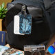 Personalized statement luggage tag with abstract butterfly art in vivid blues.