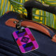 Geometric triangles pattern in magenta, pinks and purples with central monogram.