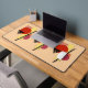 A black triangle divided into segments, a black trapezoidal band divided into two, a red circle, a yellow rectangle, a pale red square, a purplish circle, and an orange square feature in this abstract art of overlapping shapes by Richard H. Fay.