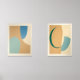 Sets de 2 impresiones abstracto boho de formas en verdes suaves. Adecuado para sala de estar con colores verde o amarillo claros . Uso de formas bonitas y simples, que siempre quedan bien en combinaciones de muebles de salón y elementos del hogar.