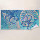 Sauvez votre place dans le sable avec cette belle serviette de plage au design abstrait et artistique dans de belles nuances de bleu et turquoise avec des accents de beige sur la vie de mer et les coquillages.