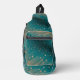 Mit diesem Abstrakten, Aquamarinen und goldenen Particle Wave Sling-Sack verbinden Sie Eleganz und Funktionalität. Mit fließenden aquamarinen Wellen, die mit weichen, goldenen Partikeln übersät sind, bringt diese künstlerische Slingtasche ein Gefühl von Ruhe und Kreativität.