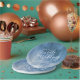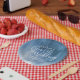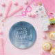 Graublau gedämpfte moderne abstrakte Kunst bemalt Hochzeitszettel Teller. Typografischer Text liest Essen, trinken & feiern die Hochzeit von dann fügen Sie Ihre eigenen Namen unter. Eine personalisierte Ergänzung zu Ihrem Hochzeitsbuffet oder Ihren Party-Tischen. Andere passende Elemente und Farben sind in diesem Design verfügbar. © Original watercolor art and design by Sarah Trett www.sarahtrett.com for www.mylittleedenweddings.com