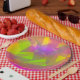 Eine interessante abstrakte Komposition. Geometrische Dreiecke und Rechtecke in Farbtönen aus coolen 60er Jahren. Grün, heiß rosa, königlich lila, Mandarine orange und vieles mehr. Diese Formen stolpern in jede Richtung und geben ein Gefühl von Bewegung und Bewegung. Ein lustiges und psychedelisches Stück.