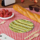 Ein lustiges und farbenfrohes abstraktes Muster inspiriert durch Fensterformen und architektonische Formen in Grün, Blau, Orange, Schwarz und Weiß. Abstrakte Tischdekoration zum Feiern einer Hauswärmung, erste Wohnung, neue Zuhause, bewegtes Party.