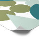 Ein spielerisches Muster geometrischer Formen, das eine abstrakte Landschaft in einer sanften Farbpalette aus aquamarinen, Senf-, Korallen-, Rost- und Moosfarben bildet.