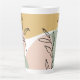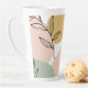 Elegante und trendige latte Tasse mit Bio abstrakten Formen und botanisch gezeichneten Blätter in Kontur zeichnend Stil. Die Farbpalette des Designs ist ockergelb, grün und rot.