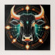 Moderne künstlerische Darstellung eines leuchtenden Taurus Zodiac mit komplizierten geometrischen Designs, lebhaften Farben und futuristischen Elementen. Symbolismus umfasst Stärke, Präzision und tief greifende visuelle Auswirkungen.