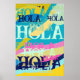 Hola Text wiederholt sich in einer farbenfrohen Palette von Blau, Gelb, Rosa, Türkis und Grün.