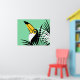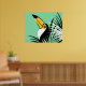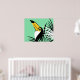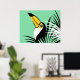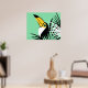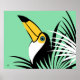 Tropische Dschungelkunst des Toco Toucan auf aquamarinem Hintergrund mit Palmenfronten
