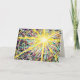 Eine Christliche Osterkarte, die die Auferstehung Jesu feiert. Eine gelbe und aqua ruhmreiche Sternexplosion auf schwarz strukturiertem Hintergrund, abstrakte Kunstmalerei. Auf der Innenseite dieser Karte ist der Bibelverse von John11:25-26 'Ich bin die Auferstehung und das Leben. Wer an mich glaubt, wird noch leben, selbst wenn er stirbt. Wer auch immer lebt und an mich glaubt, wird nie die.', der aus der World English Bible (WEB)-Version stammt. Kunstwerk der Künstlerin Catherine Sweetman.