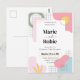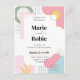 Das Design zeichnet sich durch einen lebhaften und farbenfrohen abstrakten Hintergrund aus, der eine Aussage macht und den Ton für eine lebendige und fröhliche Feier Set. Ideal für Paare, die eine Touch von Spaß und Modernität zu ihren Hochzeitsfeiern hinzufügen möchten. Der Text ist sauber und elegant, kontrastiert gut mit dem spielerischen Hintergrund und macht die Einladung leicht lesbar, während sie noch optisch ansprechend ist.