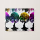 Dieses einzigartige abstrakte Design besteht aus einer Reihe von vier farbenfrohen Bäumen, die nebeneinander stehend sind. Die abstrakten Blätter sind lebendig und abwechslungsreich und reichen von Purpur, Gelb, Blues und einem weißen Hintergrund.