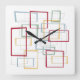 Diese trendige Uhr Mitte des Jahrhunderts mit dunkelroten, hellblauen, sanft grünen und gelben abstrakten Quadraten und Rechtecken. Es wird durch dünne, abstrakte Quadrate und Rechtecke hervorgehoben. Fügen Sie Ihrer Wohngestaltung einen Pop Retro-Spaß hinzu!