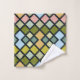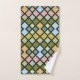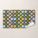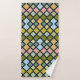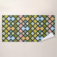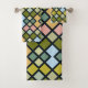 Ein farbenfrohes Badetuch-Set mit verschiedenen farbigen Plätzen von Grüntönen, Blues, Rosa und Tans.