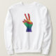 Ein abstraktes Bild der Hand des Friedenszeichens mit den Farben des Regenbogens, von CherylsArt, wird auf den Pullover gedruckt. Wählen Sie ein beliebiges Shirt aus. Ich benutzte meine eigene bemalte Hand, um dieses Design zu kreieren.