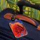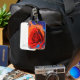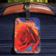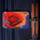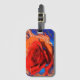 Das künstlerische Gepäckanhänger verfügt über eine moderne, abstrakte Rose aus Marmor und Rot in voller Blüte auf blauem Hintergrund.