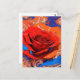 Künstlerische und moderne Postkarten zeichnen sich durch eine wunderschöne, abstrakte Rose aus, die mit Marmor in Rot und Orange in voller Blüte auf blauem Hintergrund erzeugt wurde.