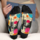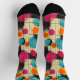 Den Kleiderschrank mit abstrakten Socken mit bunten Rundmustern und ausdrucksstarken Pinselstrichen verzieren. Set vor einem cremefarbenen und schwarzen Gitteruntergrund, lebhafte Farbtöne in Rosa, Orange, aquamarin und Gelb schaffen ein lebendiges und künstlerisches Design. Diese Socken sind perfekt für lässige oder formale Outfits, die für jeden, der eine feine und stilvolle Mode Liebe, ein einzigartiges und kreatives Accessoire darstellen.