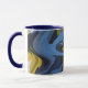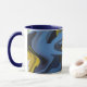 Dieses Design zeichnet sich durch ein abstraktes Muster mit mehreren Farben aus, darunter Blau, Gelb, Weiß und Schwarz. Die Formen des Designs verflechten sich in einer gewundenen und kurvenreichen Weise und erzeugen so einen dynamischen und flüssigen Effekt. Dieser Stil suggeriert Bewegung und Fluss und ruft ein Gefühl abstrakter Kunst hervor, das Gefühle oder Ideen indirekt vermittelt, ohne erkennbare oder definierte Formen zu präsentieren.