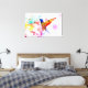 Farbenfrohe Leinwand Kunstdrucke von einer Aquarellfarbe abstrakter Kolibri und floraler Umgebung. Eine tolle Art, Zuhause oder Bürowände mit einem Pop zu versehen.