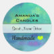 Ein einzigartiger Aufkleber zum Anpassen mit Ihrem Namen oder Ihrer Firma und Kerzenduft oder Geschmack etc....Set auf einem abstrakten Hintergrund in den Farben Grün, Blau und Gelb. Handgefertigt in einem extravaganten Schriftart mit einem kleinen, grünen Herz neben dem Text.