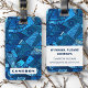Gepäckanhänger mit einem abstrakten geometrischen Muster in Blau- und Namenstönen. Kontaktinformationen auf der Rückseite.