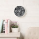 Die Wanduhr ist in einem trendigen, flüssigen Marmordesign in Schwarz und Weiß gehalten.